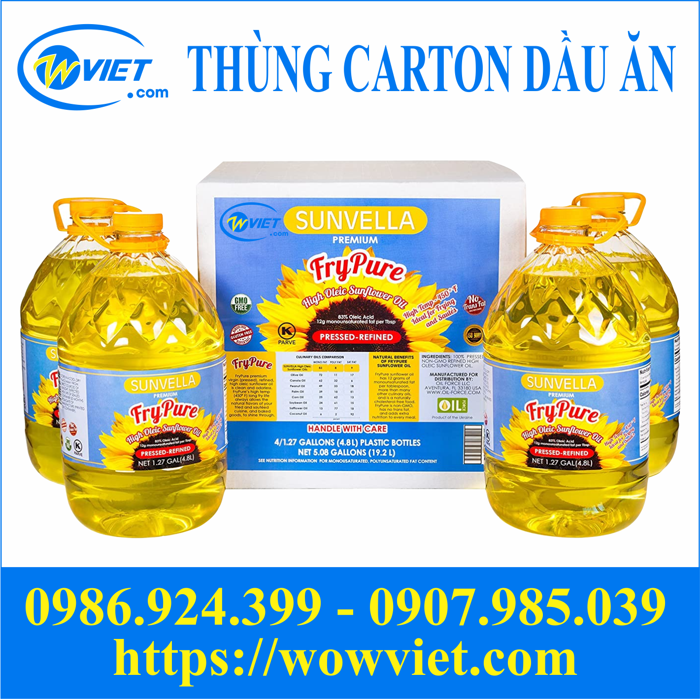 Wowviet sử dụng công nghệ in Plexo, in offset để thùng carton dầu ăn có màu sắc ấn tượng, hài hòa, đánh dấu sự khác biệt của sản phẩm dầu ăn này với những nhãn hiệu khác.
